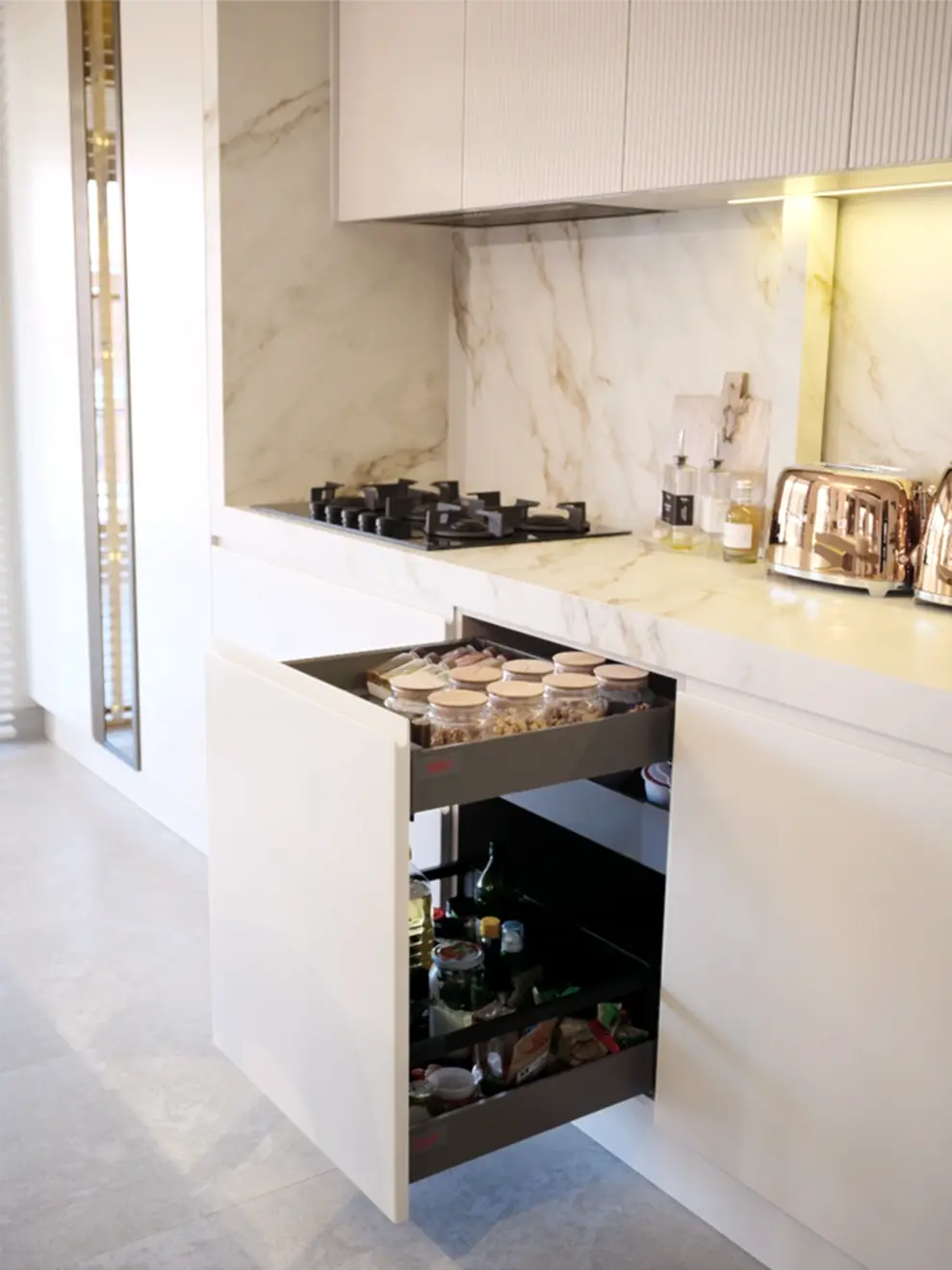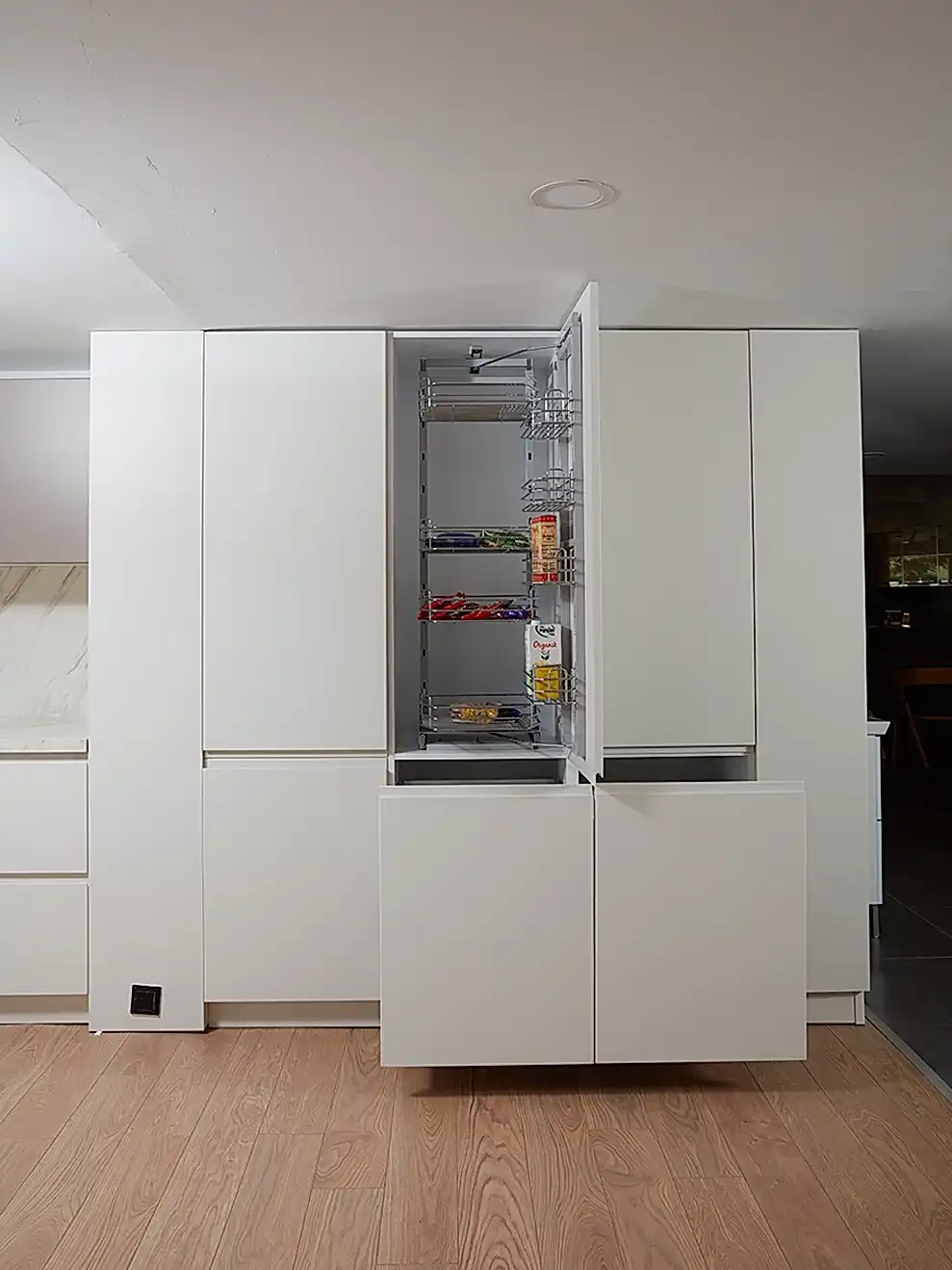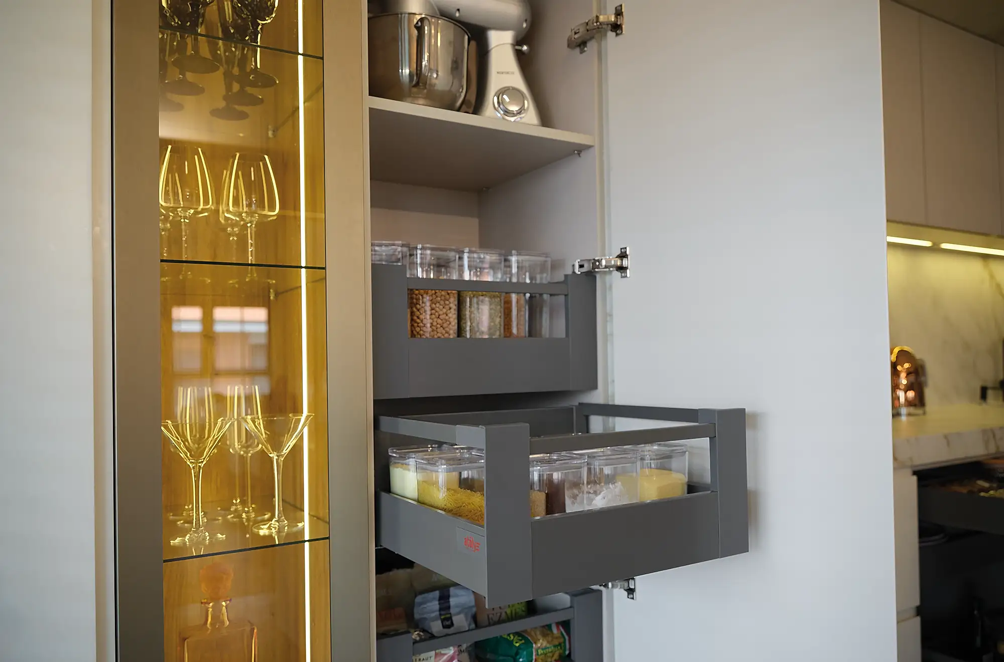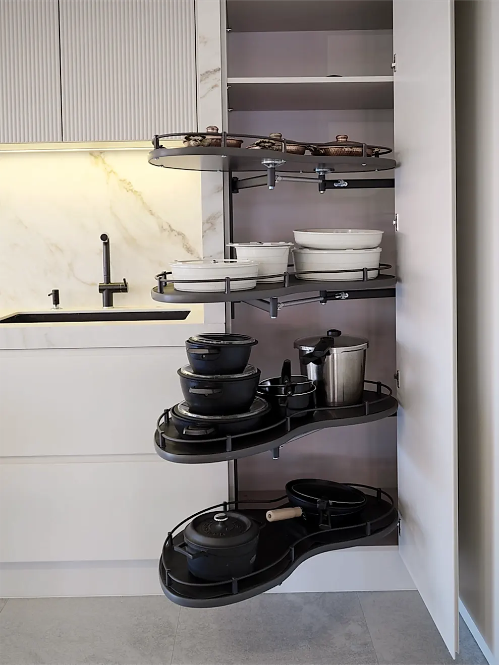 The matte lacquered surfaces, combined with lids featuring a minimalist design with built-in handles, provide a modern look and functionality for your kitchen.